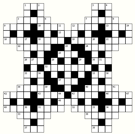 1 agrabla printempa sono, 3 ni altetaksas ĝin nur kiam ĝi mankas, 5 ne komuna, 7 supertera stato, 9 sur muzikverkoj oni legas, 10 diplomatoj uzas, 12 polusvojaĝanto devas havi, 13 lago en Azio, 15 tie okazis la unua beleckonkuro, 16 greka dio, 18 sankta Antonio havis, 19 oni kutimas fieri pri ĝi, 21 akademiano, 22 aĉetanto pri ĝi ĝojas, 24 en teatro oni vidas, 25 verkisto multe bezonas, 26 tre ofta mallongigo, 30 rusa rivero, 32 speco de pafilo, 33 scienculo ofte havas, 35 serba urbo, 37 io por ŝuoj, 38 kartludo, 40 edzino de bizantia imperiestro, 42 monduma vesto, 43 dolĉa suko, sed povas mortigi, 45 itala rivero, 46 ĉefa materialo de farbofabrikoj, 48 gaja kunesto, 49 per ĝi oni riĉiĝas (laŭdire), 51 nuntempe estas epidemio, 52 dua vorto de religia himno, 54 dombesto, 55 malagrabla mieno, 56 arbo, 57 parto de cirklo, 58 lago en Afriko.