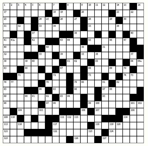 1. Polo, verkisto de Historio de Esperanto; 2. Hispano, eksprez. en Valencia; 3. M B; 4. Samid... (adjektiva formo); 5. Mallongigo komerca; 6. La unua reĝino de la Int. Floraj Ludoj; 7. Prefikso; 8. An... (korprema); 9. Komenco de la alfabeto; 10. Pola eksprezid. de la UK de Krakovo 1931; 11. Grasa fluidaĵo (en adjektiva formo); 12. Pola esp. verkisto; 14. Koparo; 15. Korelativo kaj universala konjunkcio; 16. Bulgara pioniro; 19. Inverse: prefikso; 22. Horizontala tabulo ('); 24. Subtera ejo, kun la komenca N ('); 25. Sinonimo de kunporto, neologisma vorto ('); 27. Anima premo ('); 29. Inverse: korelativo; 32. Narkota substanco ('); 34. Fonetike: perlaboro; 36. Estonteco de Esperanto; 37. Skribo por ne forgesi ('); 41a. Usona pioniro; 43. Multaj el sama afero; 44. Normanda SAT-ano; 46. H A T; 47. Muzikinstrumento kun miksitaj literoj ('); 49. Vesto por homaj membroj; 50. Mondorganizo; 53. Interjekcio; 56. Fadenforma sentorgano; 57. »Nea« vorto; 59. Sen vesto; 60. Scienca branĉo (mallongigo); 62. Pastro-redaktoro, franca esp.; 64a. Franca pioniro; 67. Grandan Esp. germanan vortaron li kunmetis; 68. Usona pioniro; 69. Pronomo; 70. Kontraŭo de »perdas«; 71. Italo, tradukis »Kurioza Okazaĵo«; 72. Konjunkcio; 75. Fare; 76. Advokato de Esperanto; 77. Inverse: komerca mallongigo, kun duobla konsonanto en la mezo; 80. Sufikso; 81. »L...« skribmaterialo, fluidaĵo; 82. ... estas kiu ne mortis; 84. Sufikso; 88. Turni en kontraŭan direkton ('); 90. Senordo (ĝi portas ĉapon surkape); 91. Ofta mallongigo inverse, kun ĉapelo erare metita sur la kapon; 92. Konsonantoj de vorto inverse signifanta konstantan agon; 94. Inversa far'; 98. Vokaloj de la vorto bela; 100. Inverse: kun ploraj okuloj; 101. Inverse: rabobirdo; 102. Grado de uzebleco; 105. Sufikso; 106. Angla esp. mortis en 1906 vizitante la UK en Genève; 110. Sufikso; 111. Alkoholaĵo ('); 112. Longecmezurilo ('); 113. Parteto de la jaro; 114. Konjugacio-finaĵo kaj prepozicio (kunskribite); 116. Tri sinsekvaj literoj de la Alfabeto; 117. Inverse: ronda vazo, sen la komenca litero ('); 119. Esprimas doloron; 120. Sufikso; 123. Ofta mallongigo en jarlibro de U.E.A.